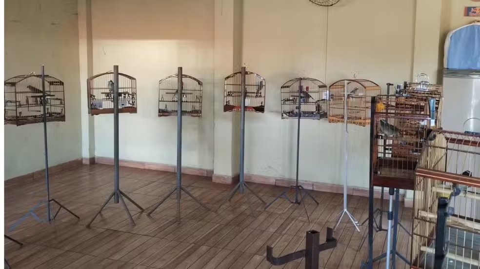 A ação foi desencadeada após uma denúncia anônima. No local, os policiais constataram o evento ilegal e apreenderam 14 pássaros em gaiolas, além de 23 suportes usados para acomodá-los.