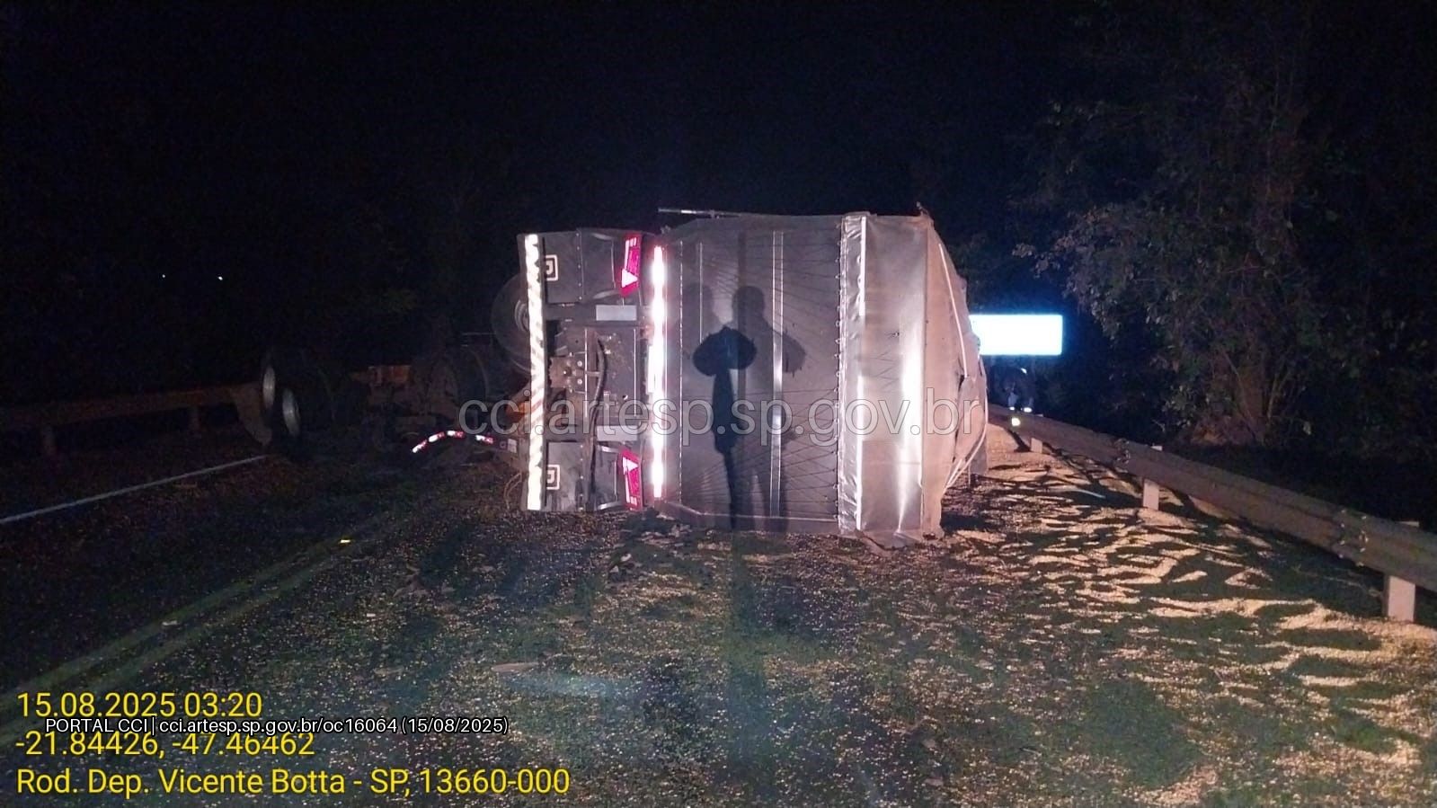 Por Agência O Movimento, 15 de agosto de 2025 –  PORTO FERREIRA – Um acidente com uma carreta carregada de milho interditou um trecho da Rodovia Vicente Botta (SP-215), na madrugada desta sexta-feira (15). O tombamento ocorreu às 2h51, na altura do km 94,8, no sentido Porto Ferreira.