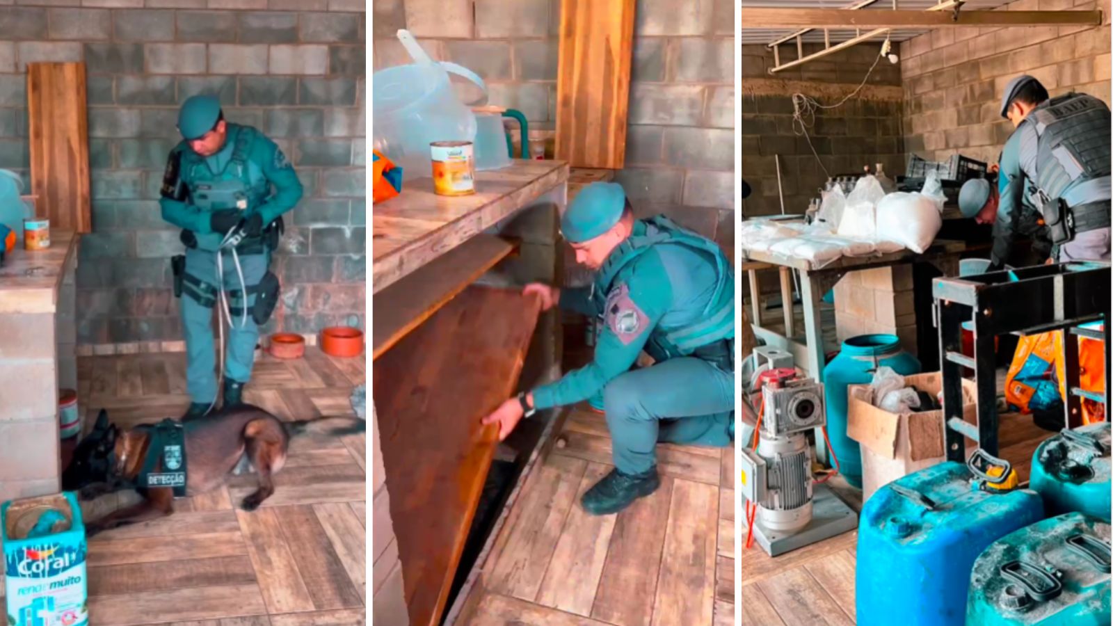 O esconderijo foi descoberto graças à atuação do cão policial, que indicou o local suspeito durante a varredura na propriedade. Escondida sob uma estrutura aparentemente comum, a instalação clandestina funcionava como um laboratório de produção em larga escala de entorpecentes.