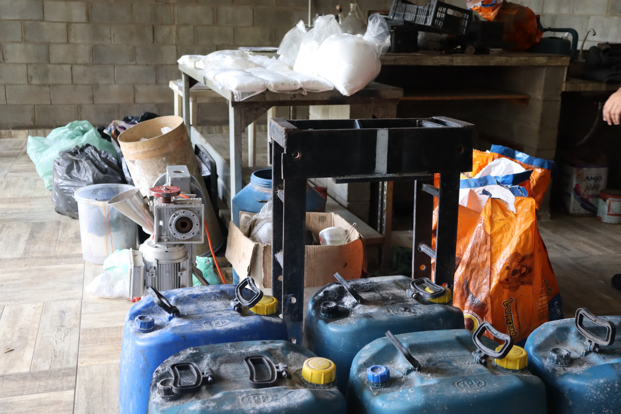 No interior do bunker foram apreendidos prensas hidráulicas, balanças de precisão, embalagens plásticas, produtos químicos e uma grande quantidade de cocaína e pasta base já embaladas para distribuição.