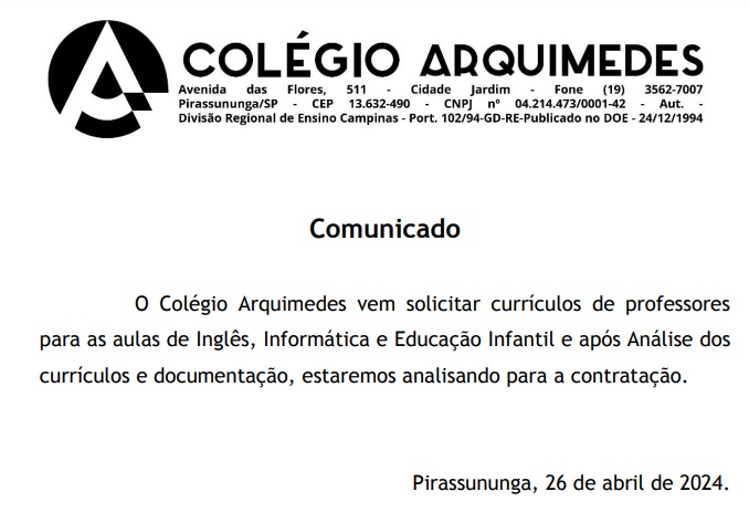 Oportunidade de emprego em Pirassununga (SP) no Colégio Arquimedes. Vagas para professores para aulas de ingês, informática e Educação Infantil. Veja abaixo: