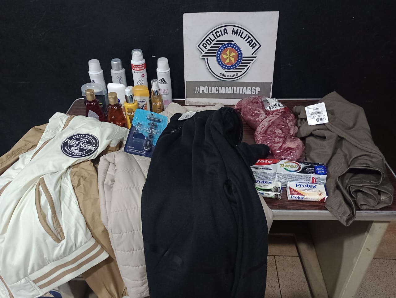 Entre os itens recuperados estavam cosméticos, desodorantes, duas blusas de frio das marcas Red Nose e ID Casual, uma camisa polo marrom ID Casual, uma calça moletom preta Norton e uma peça de filé mignon.