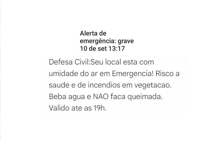 Por Agência O Movimento – A Defesa Civil de São Paulo emitiu às 13h17 desta quarta-feira (10) um alerta severo de baixa umidade para a região de Pirassununga. A notificação chegou a celulares conectados às redes 4G e 5G por meio do sistema Cell Broadcast e informou que a umidade do ar atingiu nível de emergência, com risco à saúde e possibilidade de incêndios em vegetação.