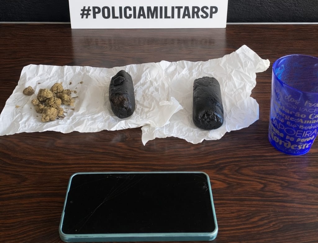 Dentro de uma bolsa no banco traseiro, os policiais apreenderam 173 gramas de haxixe e 6 gramas de maconha, além de um celular.