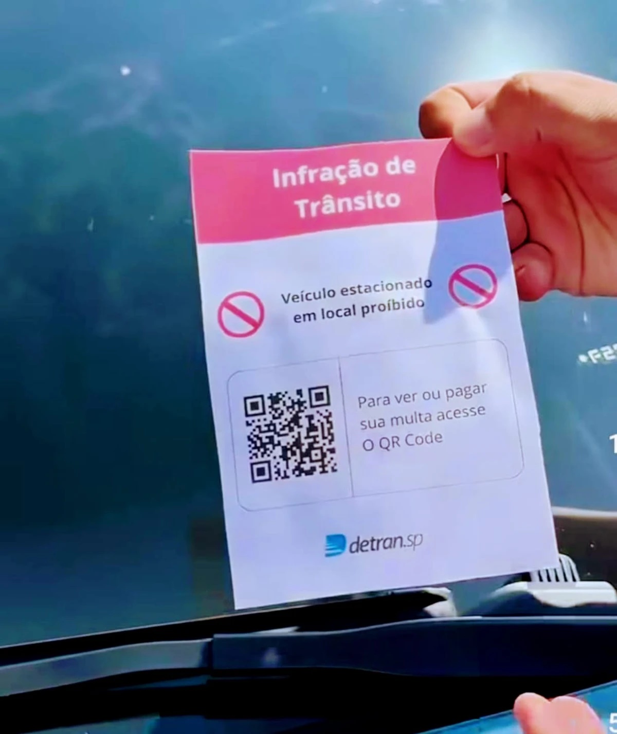 Créditos da imagem: Reprodução – É #FAKE mensagem que alerta para novo golpe de multa; notificação em cima de vidro de carro não é do Detran-SP , É #FAKE mensagem sobre novo golpe de multa; Detran-SP nega ter colocado notificação com QR Code em para-brisa de carro