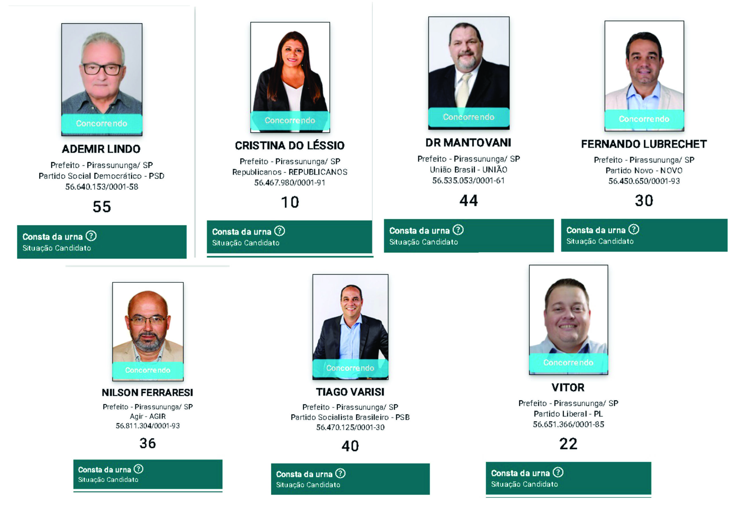 Assim os setes candidatos a prefeito de Pirassununga estão com esta denominação. Isso significa que Ademir Lindo (concorrendo com recurso) ( PSD) , Cristina do Léssio (REPUBLICANOS), Dr. Mantovani ( UNIÃO BRASIL), Fernando Lubrechet (NOVO), Nilson Ferrarezi (AGIR), Tiago Varisi (PSB) e Vitor Naressi (PL).