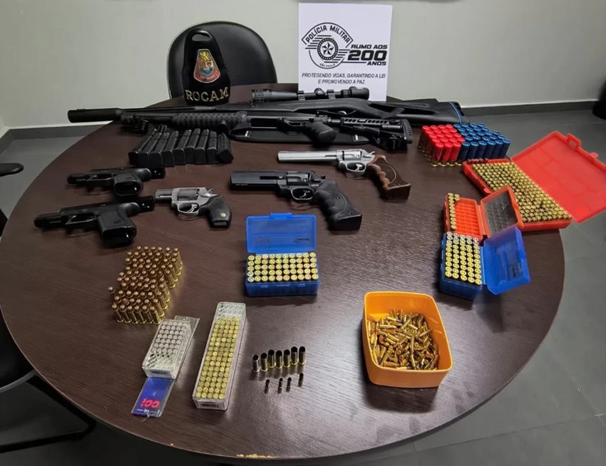 Dentro do imóvel, os policiais ficaram surpresos com o que encontraram: um verdadeiro arsenal, com sete armas de fogo — entre elas duas pistolas Glock 9mm, três revólveres Taurus, uma espingarda calibre 12 e uma carabina de pressão — além de mais de 600 munições de diferentes calibres.