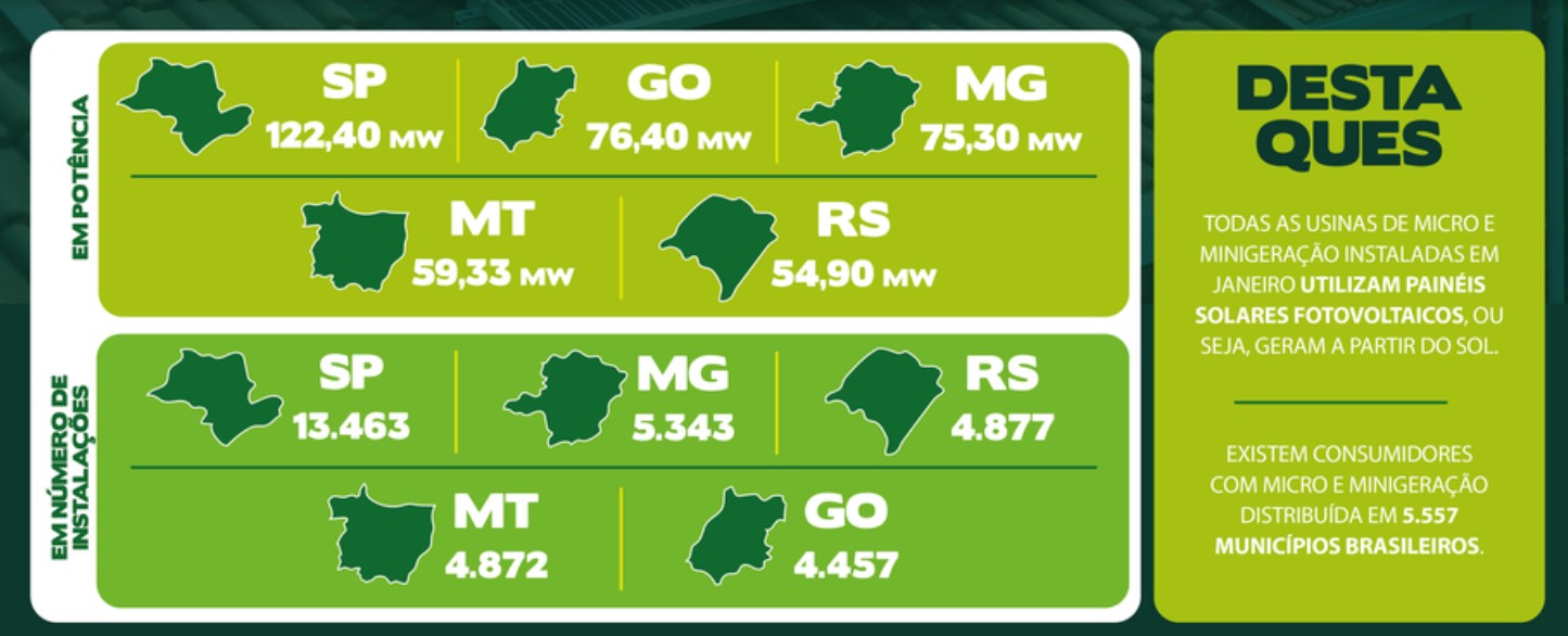 O estado de São Paulo se destacou em janeiro tanto em número de sistemas instalados quanto em potência. Foram 13.463 usinas que começaram a operar, um total de 122 MW. Já Goiás ficou em segundo lugar em expansão de potência da micro e da minigeração distribuída (MMGD) em janeiro, com 76 MW, seguido de Minas Gerais, com 75 MW.