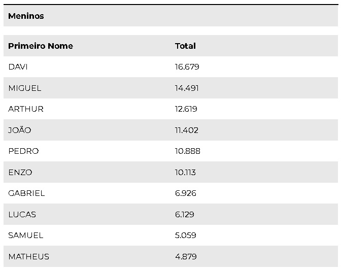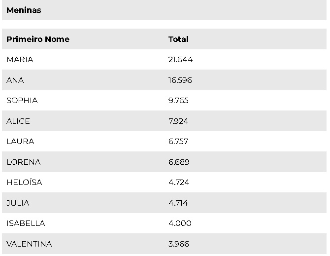 Entre as meninas, o nome Maria é seguido por Ana, Sophia, Alice, Laura, Lorena, Heloísa, Julia, Isabella e Valentina. Na lista de meninos, Davi é seguido no top 10 por Miguel, Arthur, João, Pedro, Enzo, Gabriel, Lucas, Samuel e Matheus.
