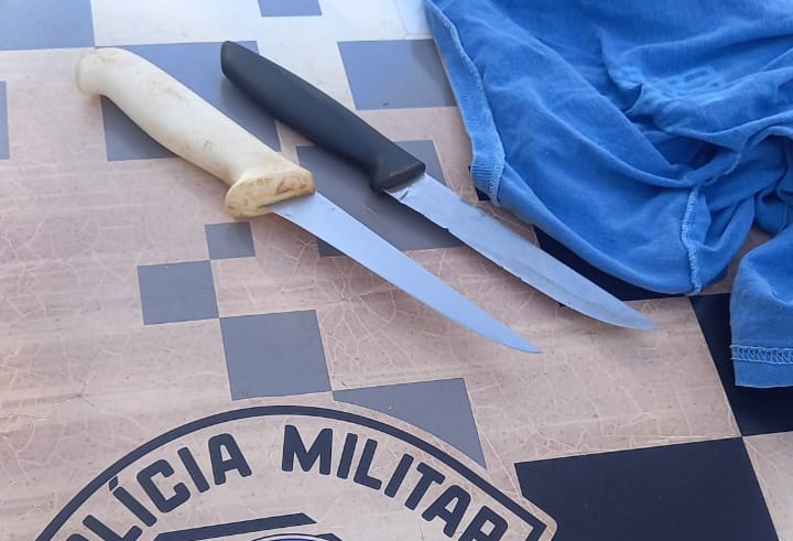 Assustada, a mulher correu até a casa de vizinhos para pedir ajuda e acionou a PM. Ao chegarem, os policiais encontraram o homem tentando se esconder nos fundos da residência. Durante a busca, localizaram as duas facas — uma sobre a mesa e outra dentro de uma mochila.