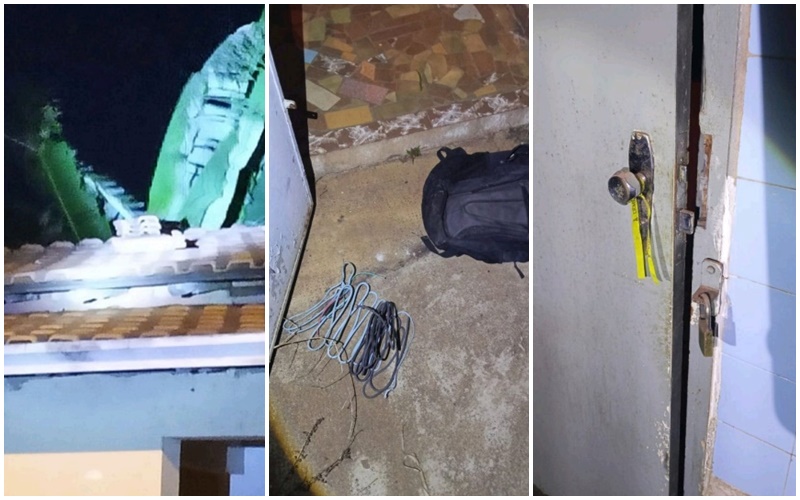 Quando chegaram ao local, os guardas encontraram o suspeito sentado na varanda, com uma torneira e fios elétricos cortados dentro de uma bolsa. A porta da cozinha estava arrombada e parte das telhas havia sido retirada para permitir a entrada no imóvel.