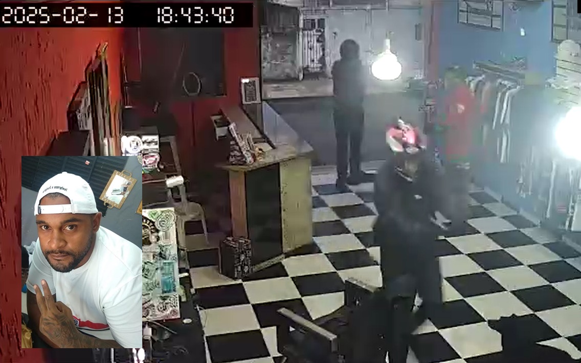 Nas imagens, é possível ver que dois homens chegam de moto e entram em um salão que funciona como uma barbearia. A dupla dispara contra Edson Caldas Vitor que estava no estabelecimento.