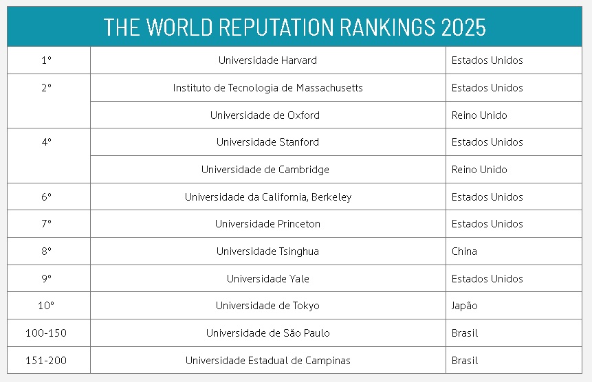 A USP (Universidade de São Paulo) é a única universidade da América Latina a figurar entre as 150 instituições com maior reputação acadêmica do mundo, segundo o THE World Reputation Ranking 2025, elaborado pela consultoria britânica de educação superior Times Higher Education (THE) e divulgado na terça-feira, 18.