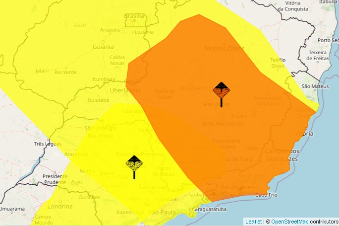 De acordo com o Instituto Nacional de Meteorologia (Inmet), a região, em alerta laranja, pode registrar de 20 a 30 milímetros de chuva, podendo chegar em algumas regiões até 50 milímetros. Os ventos podem chegar até 60 quilômetros por hora e tem possibilidade de queda de granizo.