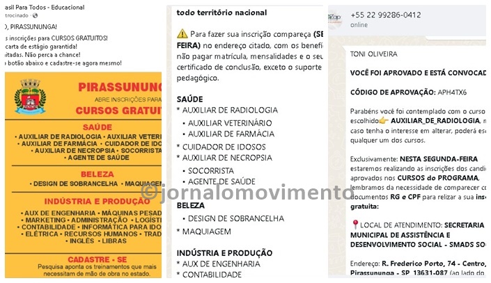 As publicações, veiculadas principalmente no Facebook e Instagram, simulam ações públicas e oferecem supostas vagas em cursos profissionalizantes — indício comum de tentativas de fraude digital. Ao acessar os links, os usuários são levados a páginas que solicitam dados pessoais ou exigem o pagamento de taxas de inscrição — apesar de se apresentarem como oportunidades gratuitas.