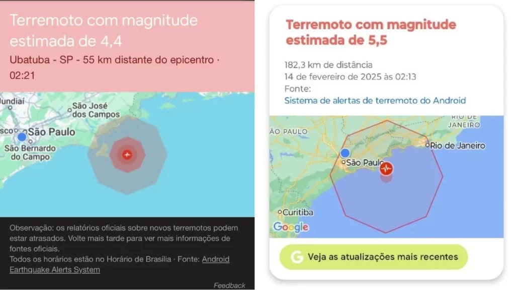 A mensagem, enviada para celulares que utilizam o sistema operacional Android, falava de registro de tremores de terra no litoral norte paulista, com epicentro a cerca de 55 quilômetros de Ubatuba.