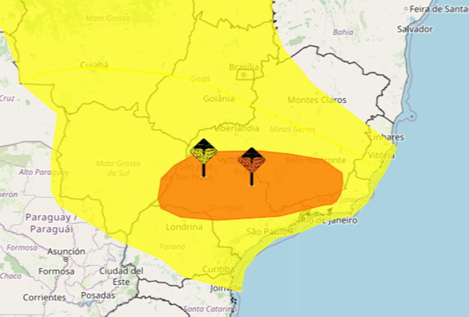 De acordo com o órgão, há previsão de chuva intensa, podendo variar entre 20 e 30 mm por hora ou até 50 mm ao longo do dia, com ventos de 40 a 60 km/h e possibilidade de granizo.
